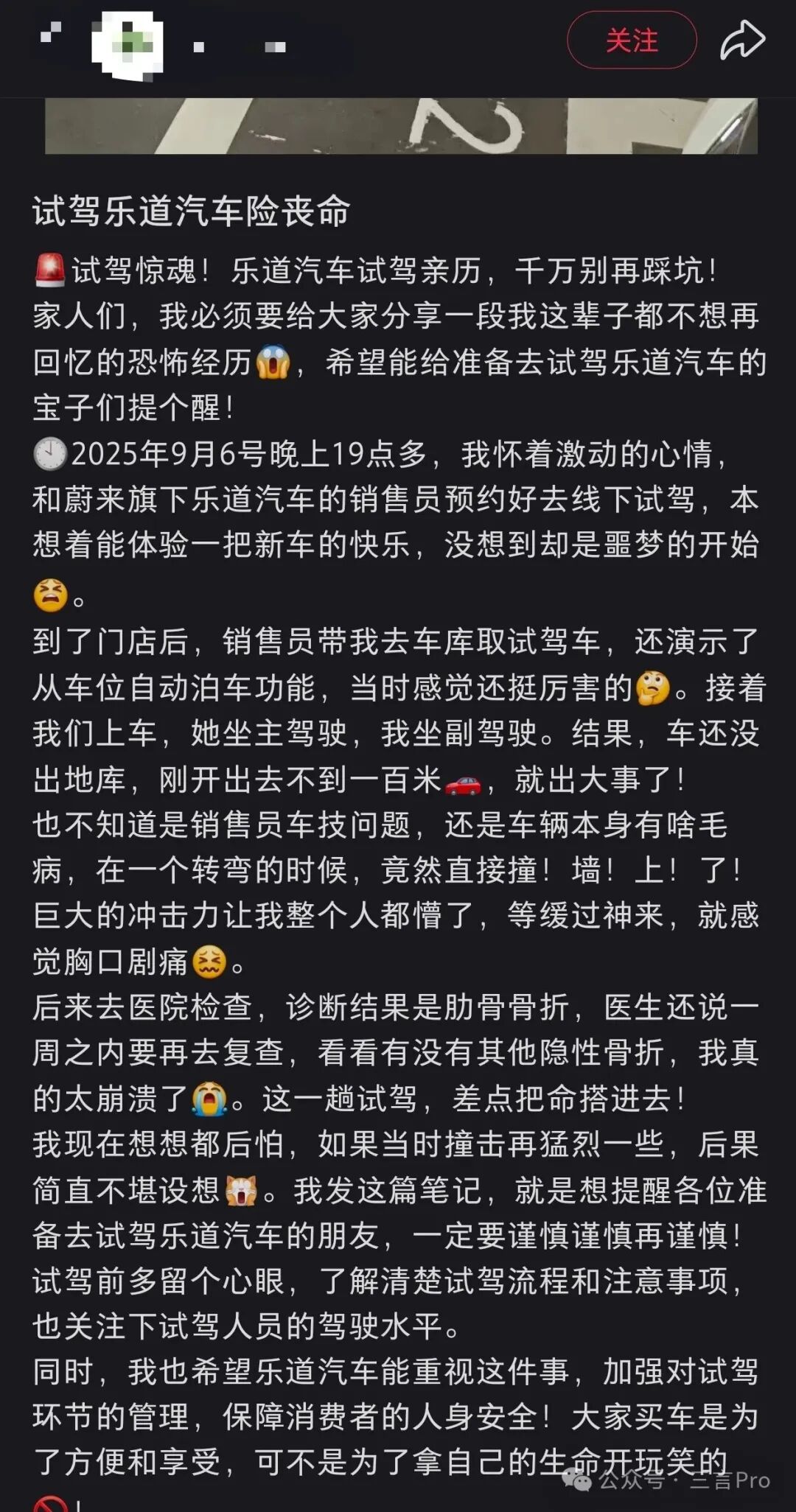 今日,有网友在社交平台发文称,其于9月6日试驾乐道时险“丧命”。