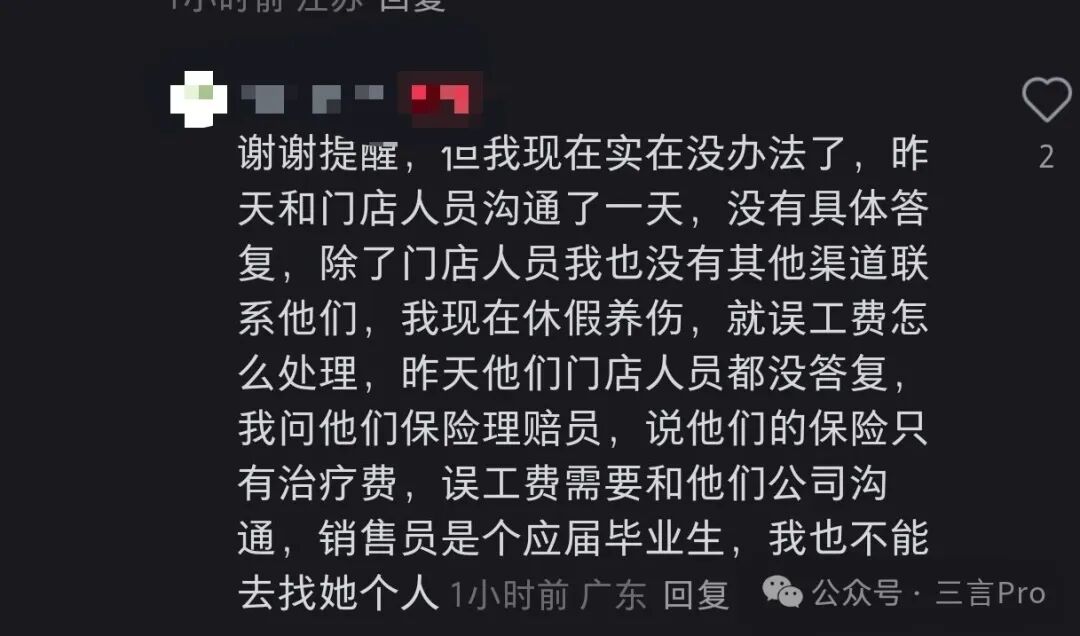 在评论区,该网友进一步透露,事发后,自己于9月7日与门店人员进行了一天的沟通,但未获得明确答复。网友提到,门店保险理赔员告知其保险仅涵盖治疗费用,误工费需另行与公司协商。
