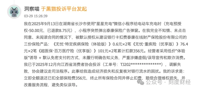 有用户在2025年9月13日使用长沙“星星充电”微信小程序充电时,仅看到平台弹出的泰康保险广告,既未点击同意也未阅读合同,就被默认授权扣费,其中《无忧·特定疾病保险(体验版)》0.6元×2笔、《无忧·重疾险(优享版)》76.4元×2笔、《超医保·百万医疗险(优享版)》101元×2笔,累计被扣356元。