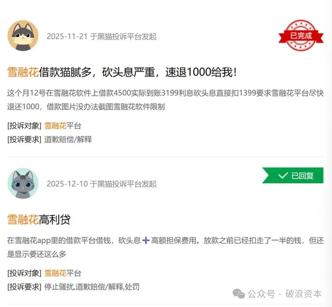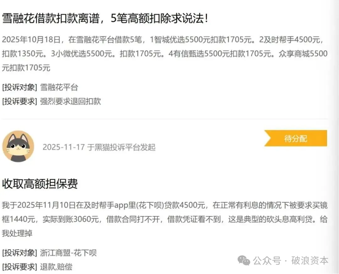 破浪资本发现的违规乱象,并非个例。在黑猫投诉平台上,关于雪融花APP的投诉居高不下,核心集中在预扣本金、捆绑消费、暴力催收三大问题。2025年11月,有用户反映,在雪融花借款4500元,实际到账仅3199元,1301元被以“服务费”名义直接扣除;另有用户表示,在平台“臻优选”板块借款4500元,被强制要求购买标价1390元的商品,借款到账后该费用立即扣除,且需在一个月内分两期还款4590元。