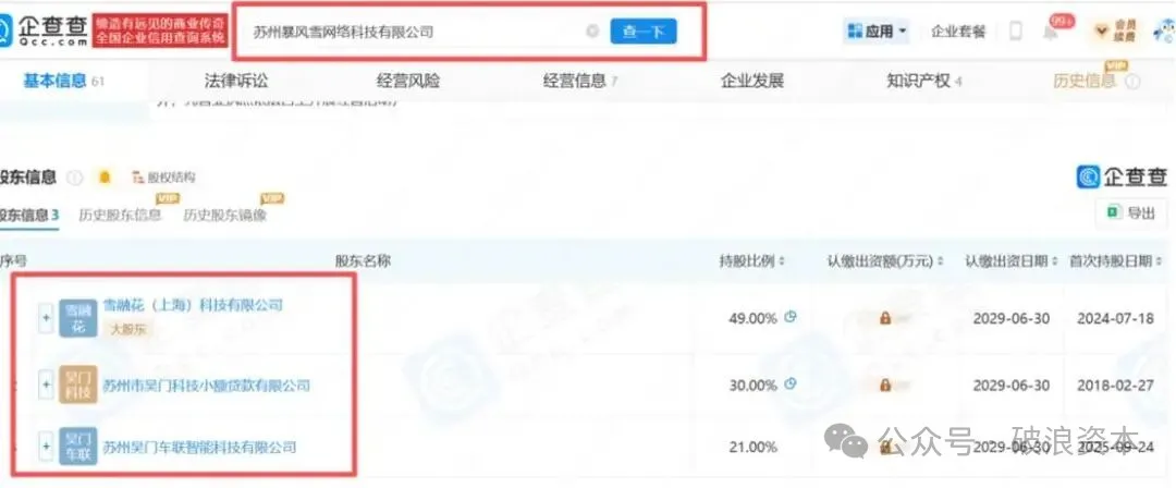 工商信息显示,暴风雪科技成立于2016年9月,注册资本200万元,当前三大股东分别为雪融花(上海)科技有限公司(持股49%)、吴门小贷(持股30%)、苏州吴门车联智能科技有限公司(持股21%)。