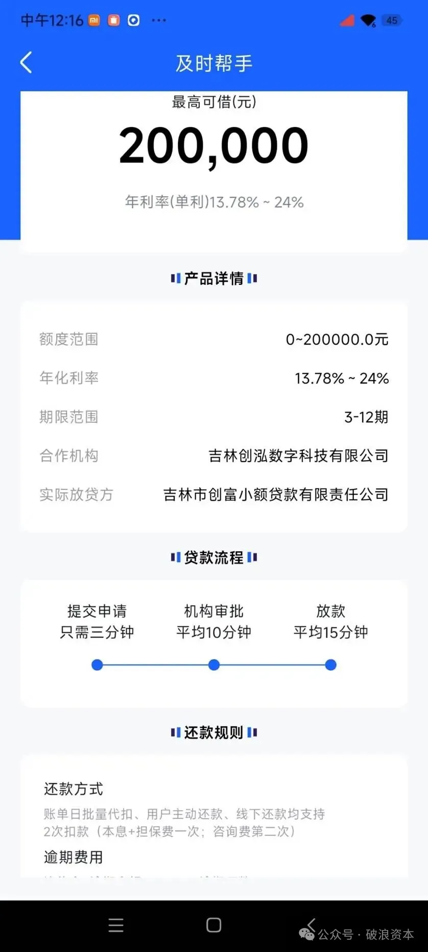 及时帮手平台宣称最高可借20万元,年化利率13.78%—24%,实际放款方为吉林市创富小额贷款有限责任公司(下称“创富小贷”)。其还款规则显示,支持账单日批量代扣、用户主动还款等方式,且明确备注“本息+担保费一次,咨询费第二次”。