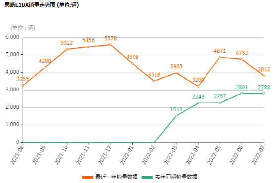 但是江淮汽车转型新能源后市场表现又不足,像思皓E20X上市后销量惨淡以撤出市场告终。而目前江淮汽车新能源车型也为数不多,表现最好为微型车的思皓E10X,但是7月份销量仅有3538辆,且呈现出了销量下滑的趋势。
