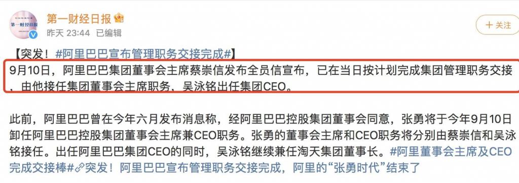 9 月 10 日深夜,阿里巴巴新任董事会主席蔡崇信发布全员信称,已按计划完成集团管理职务交接,由他接任集团董事会主席职务。