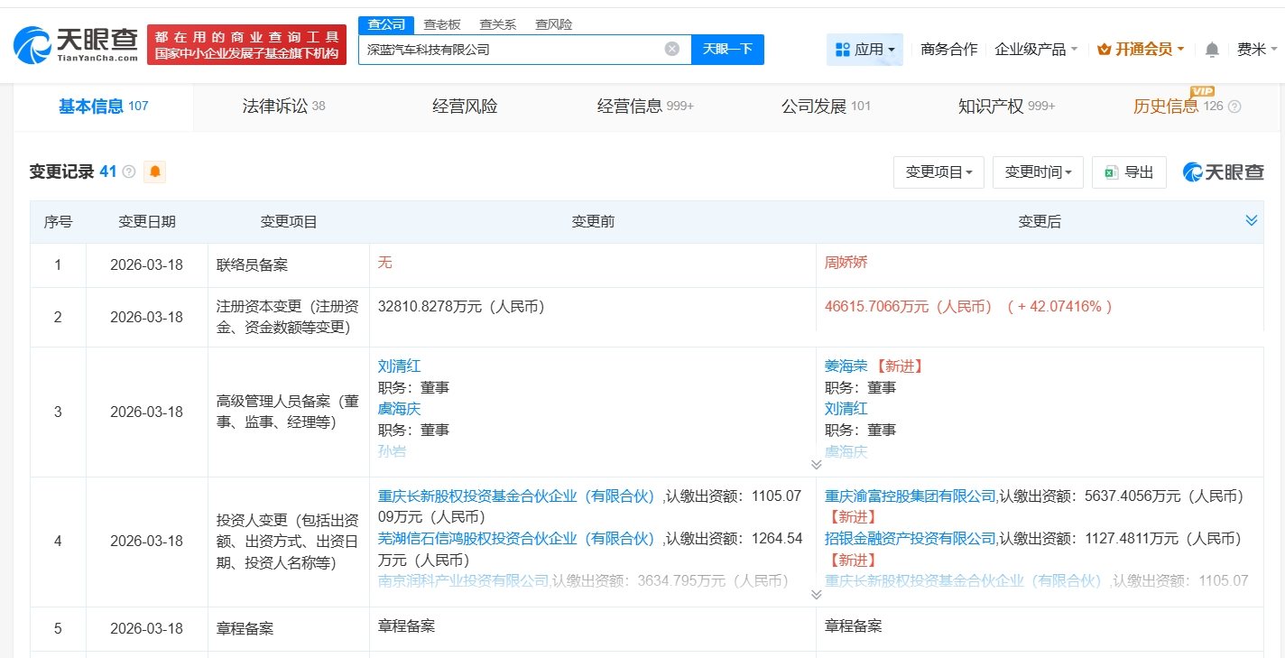 天眼查工商信息显示,近日,深蓝汽车科技有限公司发生工商变更,新增重庆渝富控股集团有限公司、招银金融资产投资有限公司为股东,注册资本由约3.3亿人民币增至约4.7亿人民币,增幅约42%。