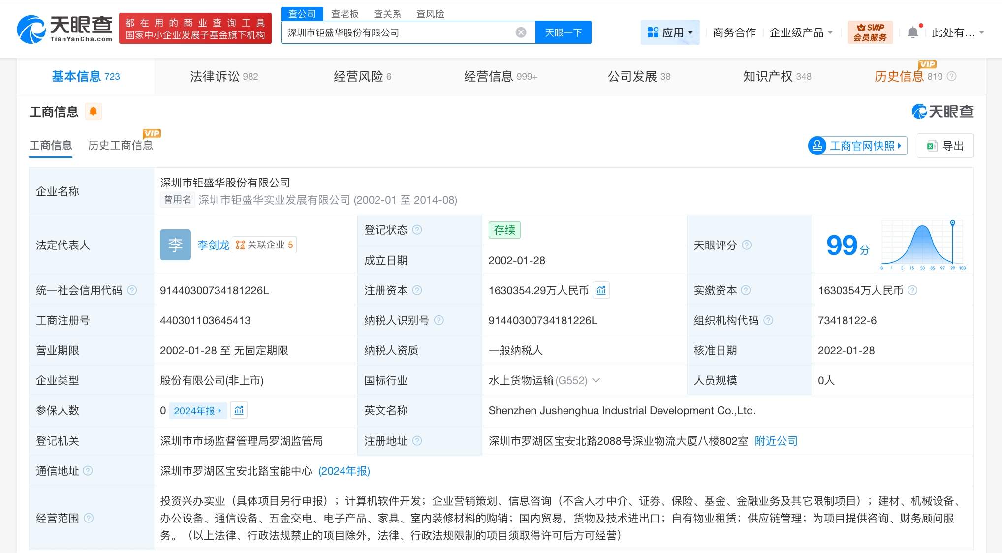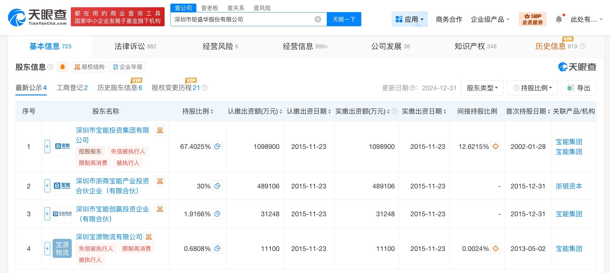 深圳市钜盛华股份有限公司成立于2002年1月,法定代表人为李剑龙,注册资本约163亿人民币,经营范围含投资兴办实业,计算机软件开发,企业营销策划、信息咨询等。股东信息显示,该公司由深圳市宝能投资集团有限公司、深圳市浙商宝能产业投资合伙企业(有限合伙)、深圳市宝能创赢投资企业(有限合伙)、深圳宝源物流有限公司共同持股。