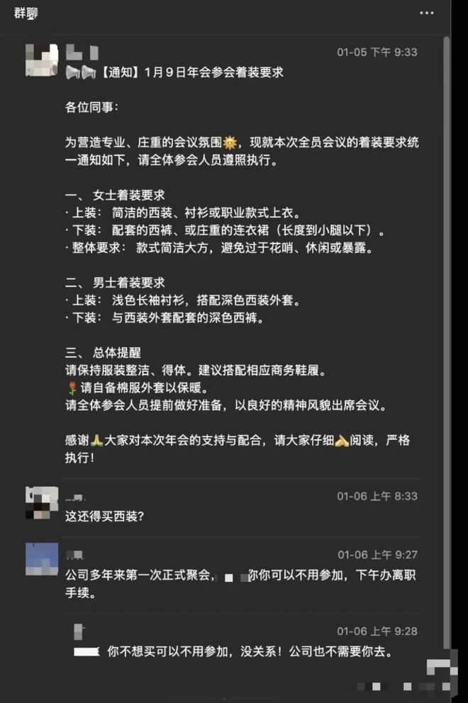聊天截图显示,该公司将于1月9日开展年会,要求全体员工统一穿着西装。