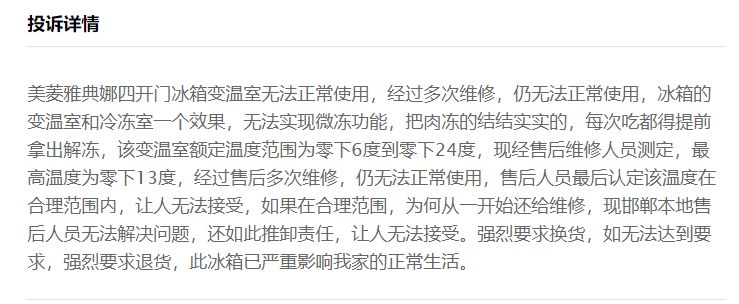 在聚投诉,有消费者吐槽美菱雅典娜四开门冰箱变温室无法正常使用。这款冰箱所宣传的微冻功能,也形同虚设。甚至经过多次维修,仍无法正常使用。