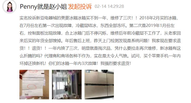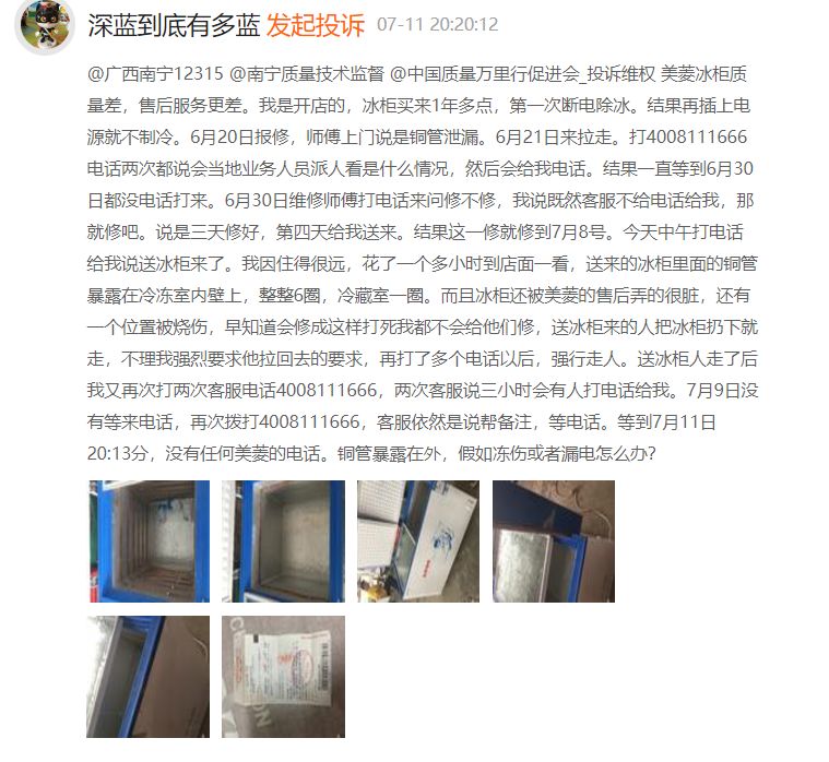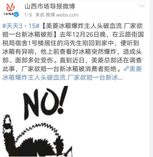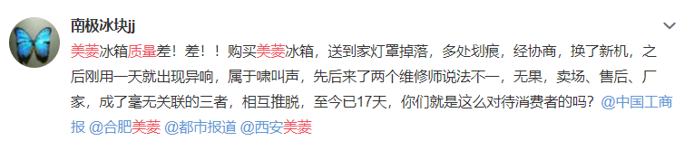 而在微博上,吐槽美菱冰箱质量问题的消费者更多。化霜溶断器一年维修三次、冰箱直接爆炸导致消费者受伤……类似的质量问题比比皆是,美菱冰箱的质量已成为了大问题。