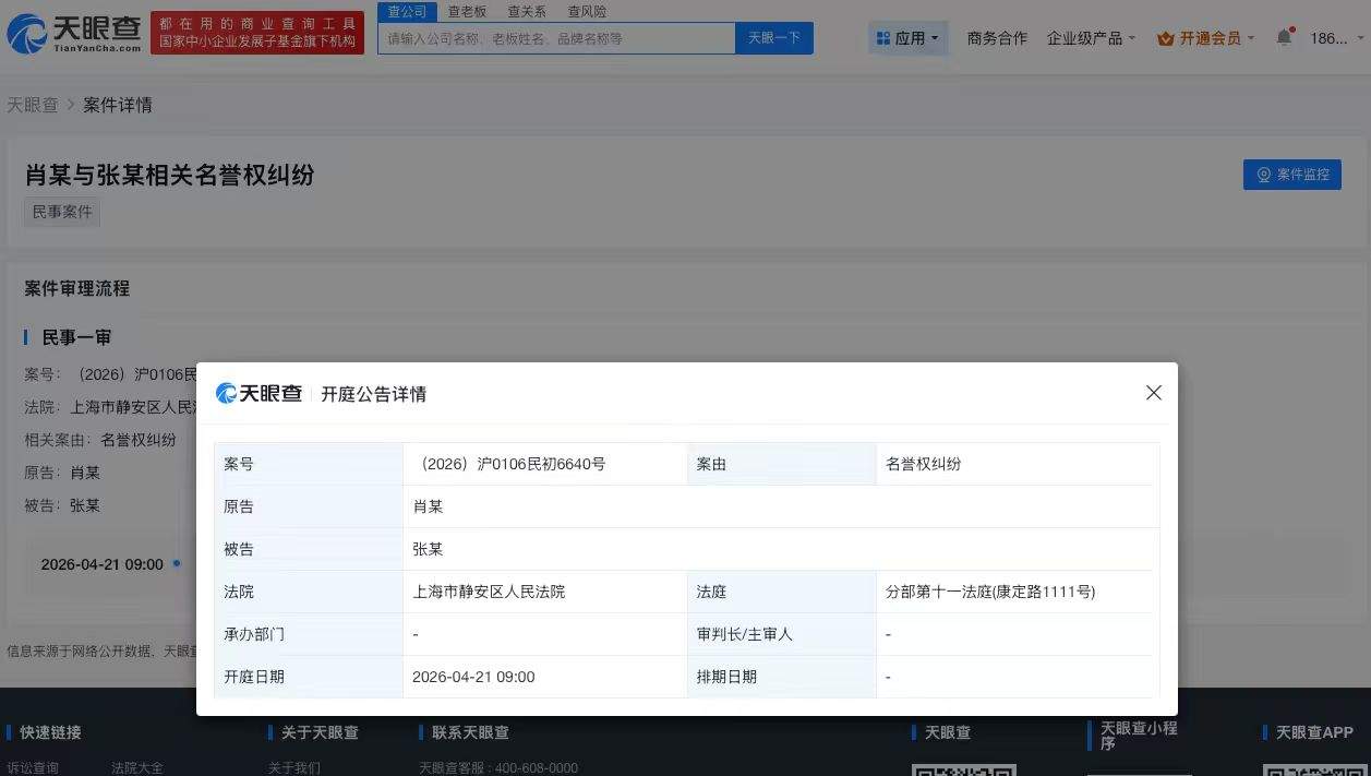 天眼查App显示,近日,肖战与张某相关名誉权纠纷案件新增一则开庭公告,原告为肖战,该案将于4月21日在上海市静安区人民法院开庭审理。