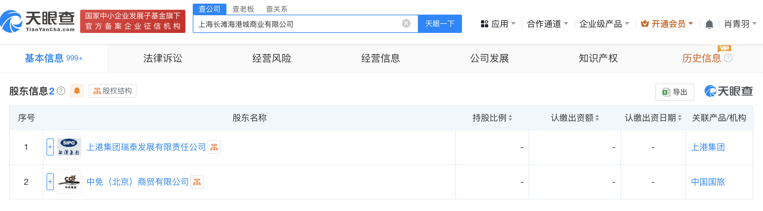 天眼查App显示,近日,上海长滩海港城商业有限公司成立,法定代表人为周君康,注册资本1亿人民币,经营范围含非居住房地产租赁、房地产咨询、物业管理、企业管理咨询、商业综合体管理服务、停车场服务等。股东信息显示,该公司由上港集团瑞泰发展有限责任公司、中免(北京)商贸有限公司共同持股。