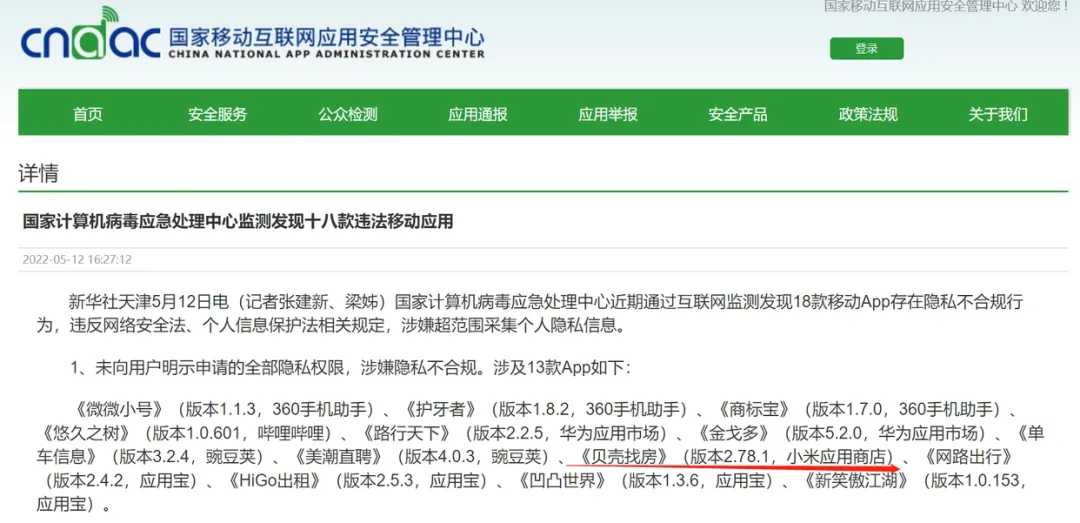 作为房地产服务行业的头部企业,始终伴随着贝壳找房的是争议不断的隐私泄露问题。早在2022年5月,国家计算机病毒应急处理中心就公布了18款存在隐私不合规行为的移动App,其中贝壳找房APP因“未向用户明示申请的全部隐私权限,涉嫌隐私不合规”被点名。2025年2月,《贝壳找房|二手房新房租房装修》(版本9.91.2,微信小程序)再次被国家计算机病毒应急处理中心点名,涉嫌“因个人信息处理者未能根据个人信息的处理目的、处理方式、信息种类以及对个人权益的影响、可能存在的安全风险等,采取相应的加密、去标识化等安全技术措施。”