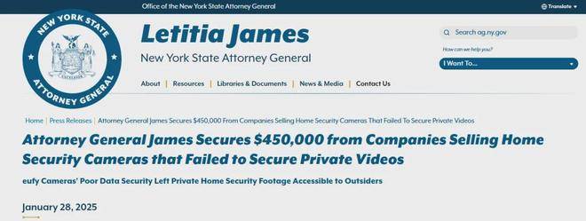 但在2025年1月28日,纽约州总检察长办公室披露,三家分销eufy安防产品的公司因未能充分保护用户私密视频达成45万美元和解。尽管被追责主体是分销商,但调查所指向的加密与鉴权漏洞发生在eufy产品链条上,让该条产品线又蒙上一层阴影。