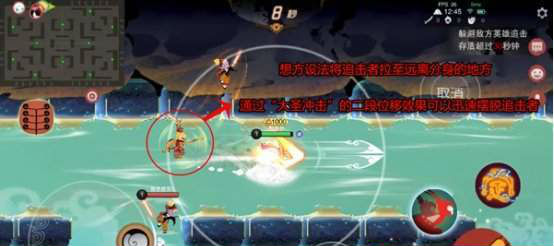 当孙悟空在释放第一次“大圣冲击”后会有4秒左右的时间供我们再次释放技能,只要在前3秒利用水法宝的闪烁效果将追击者引至远离分身的地方,最后一秒回到分身所在地并反向移动就能瞬间拉开与追击者的距离,通常来说至少可以争取3秒的安全时间。