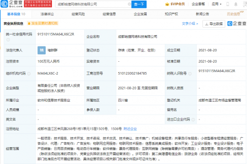 【TechWeb】企查查APP显示,8月20日,成都哈捷网络科技有限公司成立,法定代表人为褚轶群,注册资本100万元人民币,经营范围包含:电动自行车销售;软件销售;票务代理服务;互联网销售;酒店管理等。