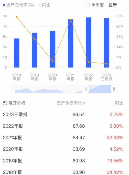 从偿债能力指标表现来看,2018年-2022年以及2023年前三季度,永辉超市的资产负债率分别为50.96%、60.93%、63.69%、84.47%、87.68%、86.54%。