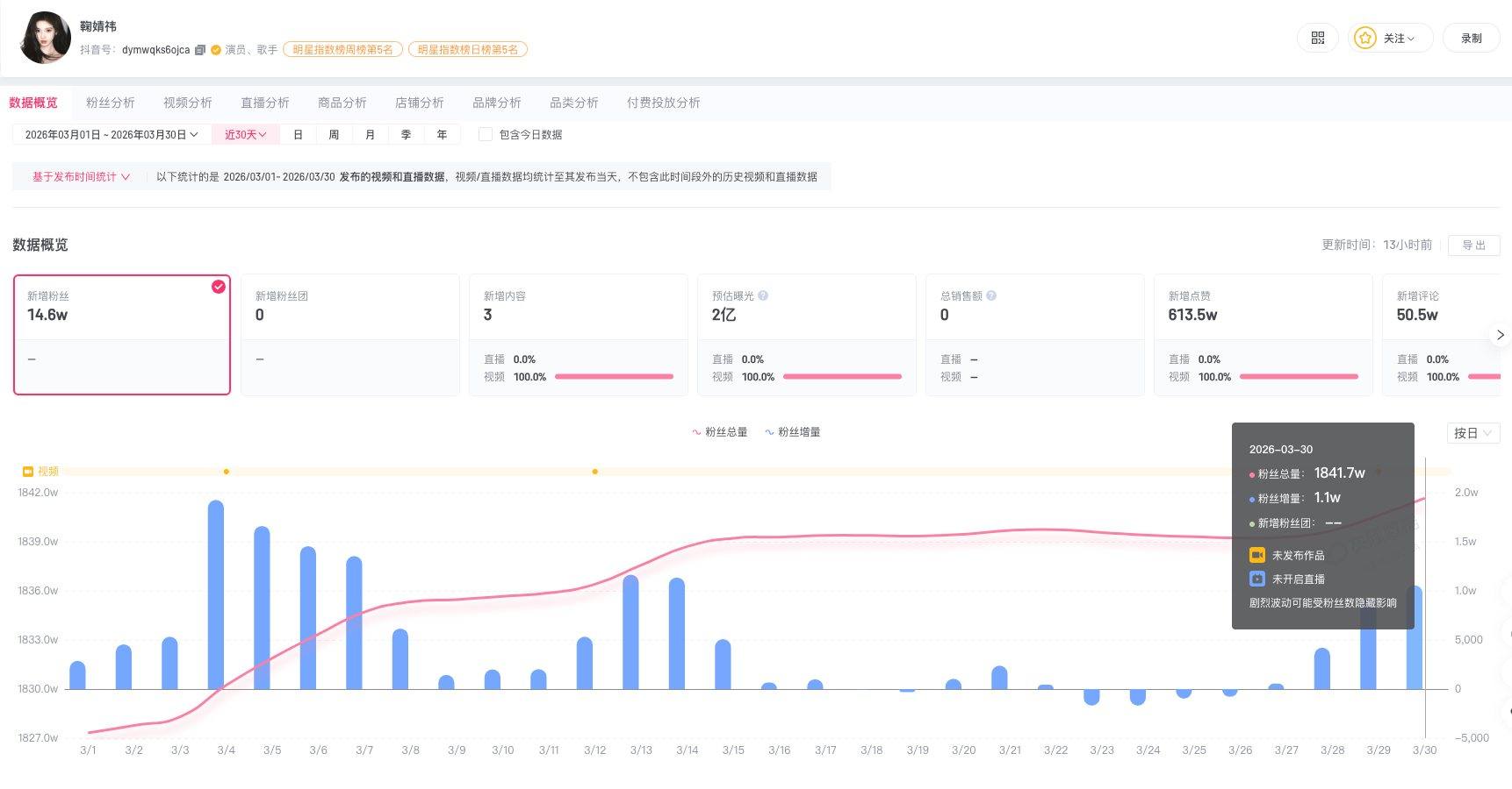 第三方数据显示,鞠婧祎平台近30日涨粉14.6万,3月30日单日涨粉1.1万。