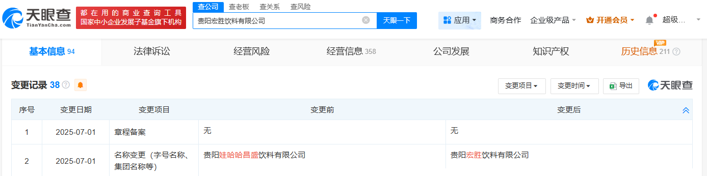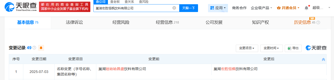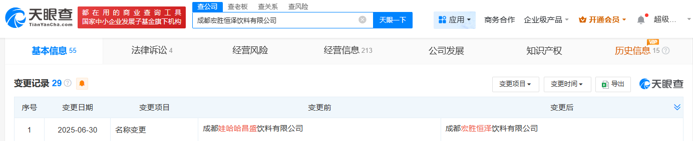 值得注意的是,近期,宗馥莉名下贵阳娃哈哈昌盛饮料有限公司、成都娃哈哈昌盛饮料有限公司、巢湖娃哈哈昌盛饮料有限公司等多家名称中含“娃哈哈”的公司,企业名称变更为“宏胜”相关。