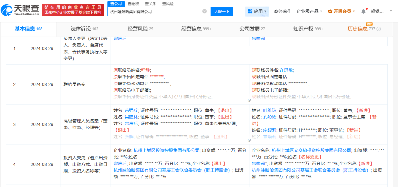 天眼查商业履历信息显示,宗馥莉名下关联210余家企业,其中200余家为存续或开业状态,宗馥莉在上述企业中担任董事长、总经理等职务,并持有10余家企业股份。自父亲去世后,宗馥莉已接手父亲名下包括杭州娃哈哈集团有限公司、娃哈哈商业股份有限公司、杭州娃哈哈启力食品集团有限公司等多家公司。目前,宗馥莉已于去年8月接手父亲名下杭州娃哈哈集团有限公司股份,成为该公司第二大股东,持股29.4%。