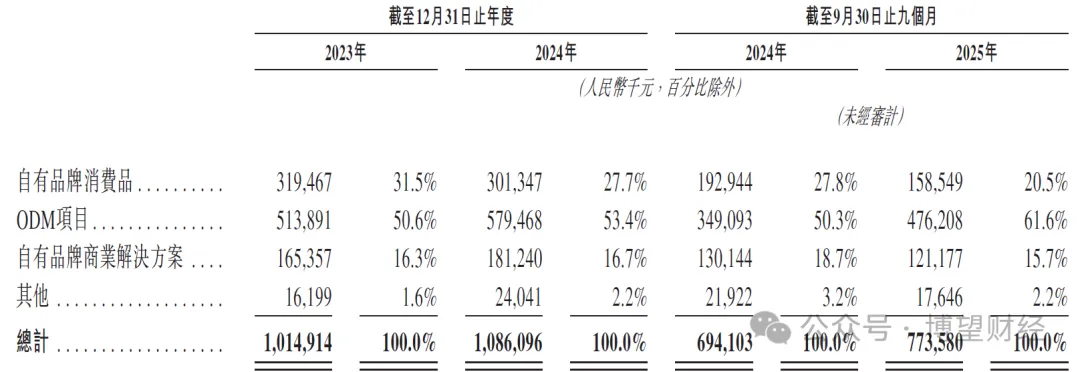 2023年至2025年前三季度,其ODM业务收入占比从50.6%一路攀升至61.6%,已然成为营收支柱。与此相反,代表核心品牌竞争力的自有品牌消费品收入,不仅在2025年前三季度同比下滑,其收入占比更从31.5%萎缩至20.5%。