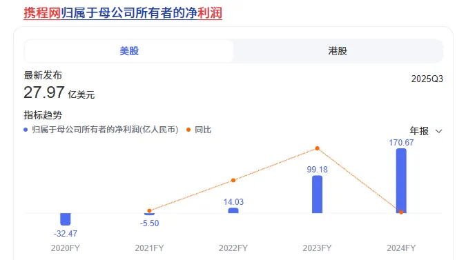 如果说2025年三季度的净利润有一次性因素影响,那么疫情后的持续盈利,才真正体现了携程的“躺赚”能力。
