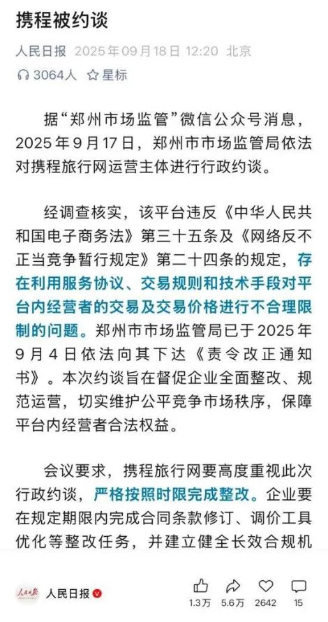 比如今年8-9月,贵州省市场监管局、郑州市市场监管局都先后约谈携程,直指其存在强制开通调价助手、二选一剥夺商家自主定价权等问题,涉嫌违反《反垄断法》和《价格法》。