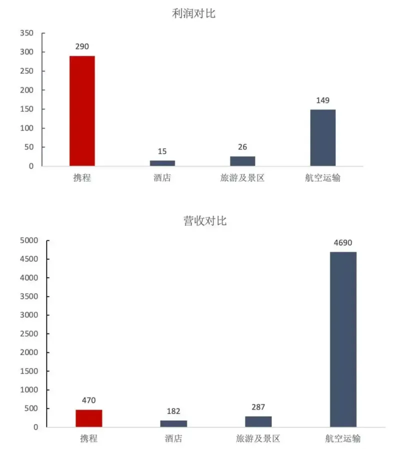 数据显示,A股旅游链各子版块在今年前三季度的净利润分别是,酒店15亿元、景区26亿元、航空运输149亿元,合计约190亿元。而携程前三季度累计净利润290亿元,盈利能力是行业上市公司整体的1.52倍,即便剔除一次性收入影响,携程的净利润也大约是上述几个行业整体的六成。