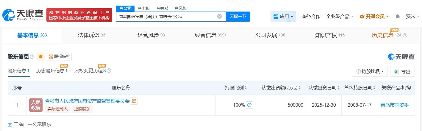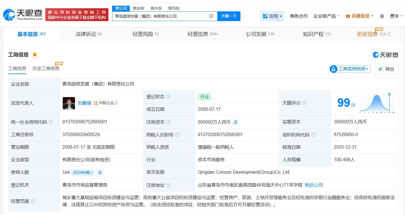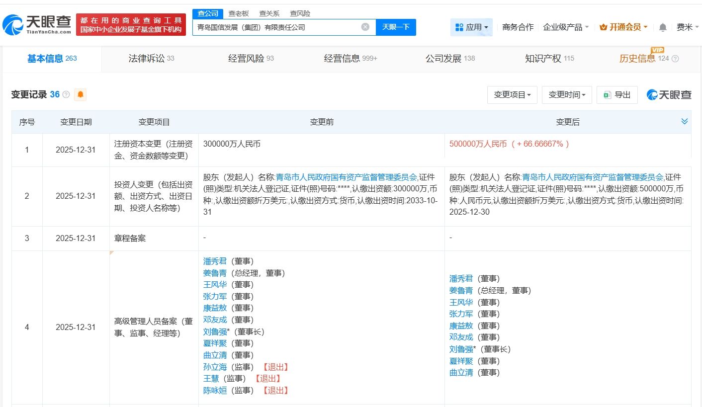 天眼查工商信息显示,近日,青岛国信发展(集团)有限责任公司发生工商变更,注册资本由30亿人民币增至50亿人民币,增幅约67%,同时,部分主要人员发生变更。