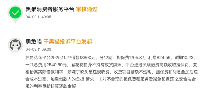 还有用户投诉称,2025年11月27日,在易花花平台借款18800元,分12期还款,担保费1705.87元,利息824.59元,逾期费10.23元,总费用2540.69元。担保费远高于利息本身,平台以“利息+担保费”的方式变相收取高额费用。
