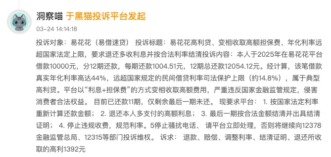 另有用户投诉称,2025年在易花花平台借款10000元,分12期还款,每期还款1004.51元,12期总还款12054.12元,经计算真实年化利率高达44%,远超国家规定的民间借贷利率司法保护上限,属于典型的高利贷。