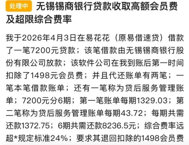 消费保投诉平台上,一名消费者投诉称,2026年4月3日在易花花平台借款7200元,由无锡锡商银行放款,分6期还款。但借款到账后,该公司立即扣除了其1498元的会员费。此外,该笔借款显示有两笔待还账单,一笔为借款账单,每期1329.03元;另一笔为贷后服务管理费用,每期43.72元。经计算,一笔7200元的借款实际到手仅5702元,但后续总计还款金额为8236.5元。