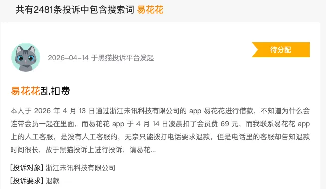 近期,一款名为“易花花”的借款平台陷入大规模投诉风波,黑猫投诉平台显示相关投诉量已达2481条,核心问题集中在高额会员费、强制担保费、砍头息及高利贷等方面。