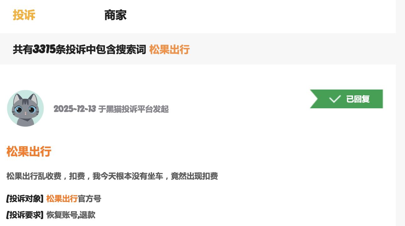 天眼查APP显示,松果出行共涉及司法案件68件,其中59件为被告,近半数案由为机动车交通事故责任纠纷,在黑猫投诉中,包含搜索词“松果出行”的共计3315条,有且不限于乱扣费、停车难、质量问题、规则不合理等等,十分影响品牌形象。