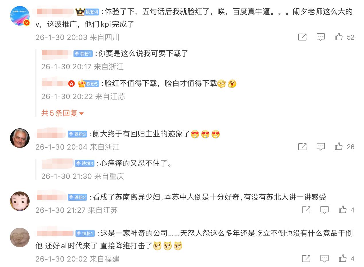 对此,诸多网友在“阑夕”的评论区回复道,“体验了下,五句话后我就脸红了,唉,百度真牛X”,“这是一家神奇的公司……天怒人怨这么多年还是屹立不倒,也没有什么竞品干倒它,还好AI时代来了,直接降维打击了。”