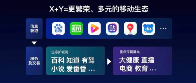 X+Y战略,百度方给出的解释是横轴是入口产品,包括,百度App,好看视频,爱奇艺等。纵轴则是好看、电商、健康等核心产品及各大垂类。