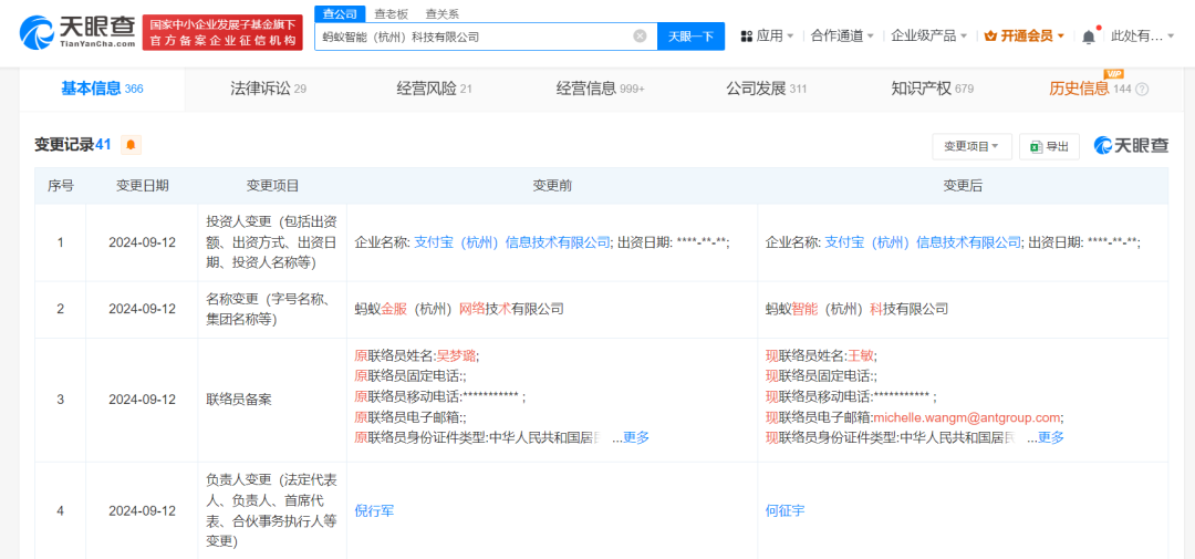 天眼查App显示,9月12日,原蚂蚁金服(杭州)网络技术有限公司发生工商变更,名称变更为蚂蚁智能(杭州)科技有限公司,同时,倪行军卸任法定代表人、执行董事,由何征宇接任法定代表人并担任董事。