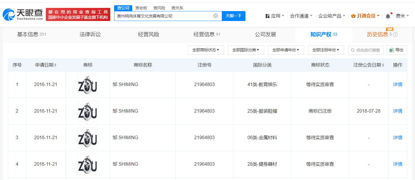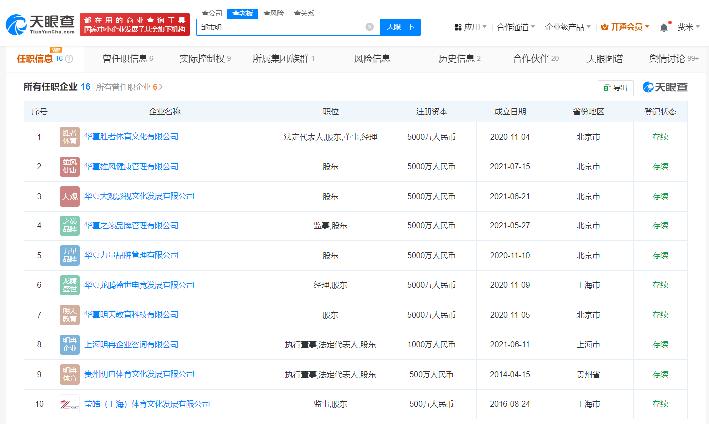 天眼查App显示,邹市明名下关联16家企业,其中13家为存续状态,包括华夏胜者体育文化有限公司、华夏雄风健康管理有限公司、华夏大观影视文化发展有限公司等,邹市明在上述企业担任法定代表人、董事、经理等职务。
