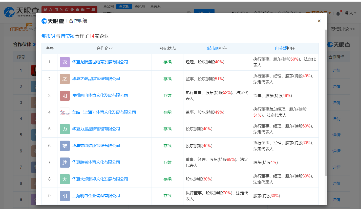 合作伙伴关系信息显示,邹市明与其妻子冉莹颖共同关联14家企业,其中12家为存续状态,包括贵州明冉体育文化发展有限公司、华夏之巅品牌管理有限公司、华夏龙腾盛世电竞发展有限公司等。