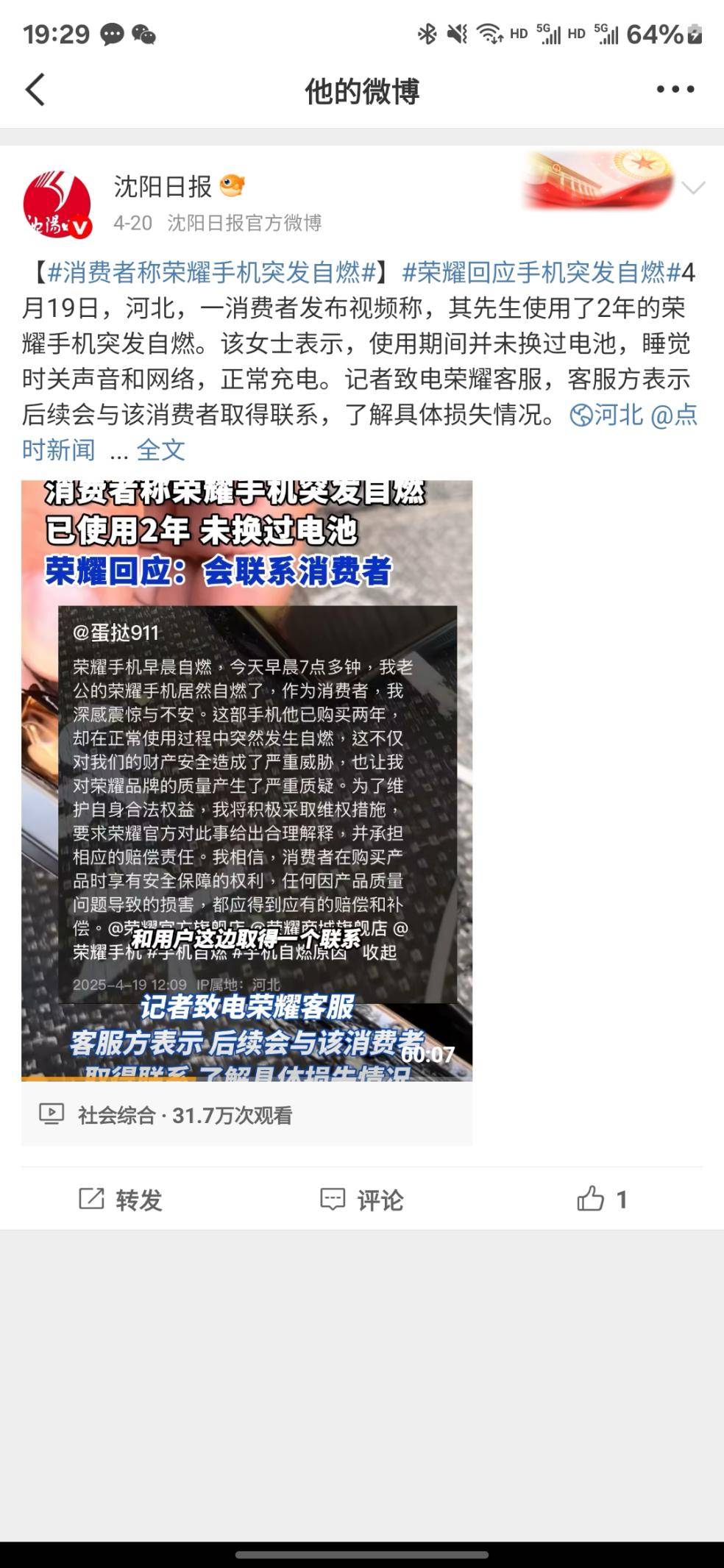 近日,有一消费者发布视频,表示使用了2年的荣耀手机突然发生自燃,并且该手机使用期间并未换过电池,并且正常充电。