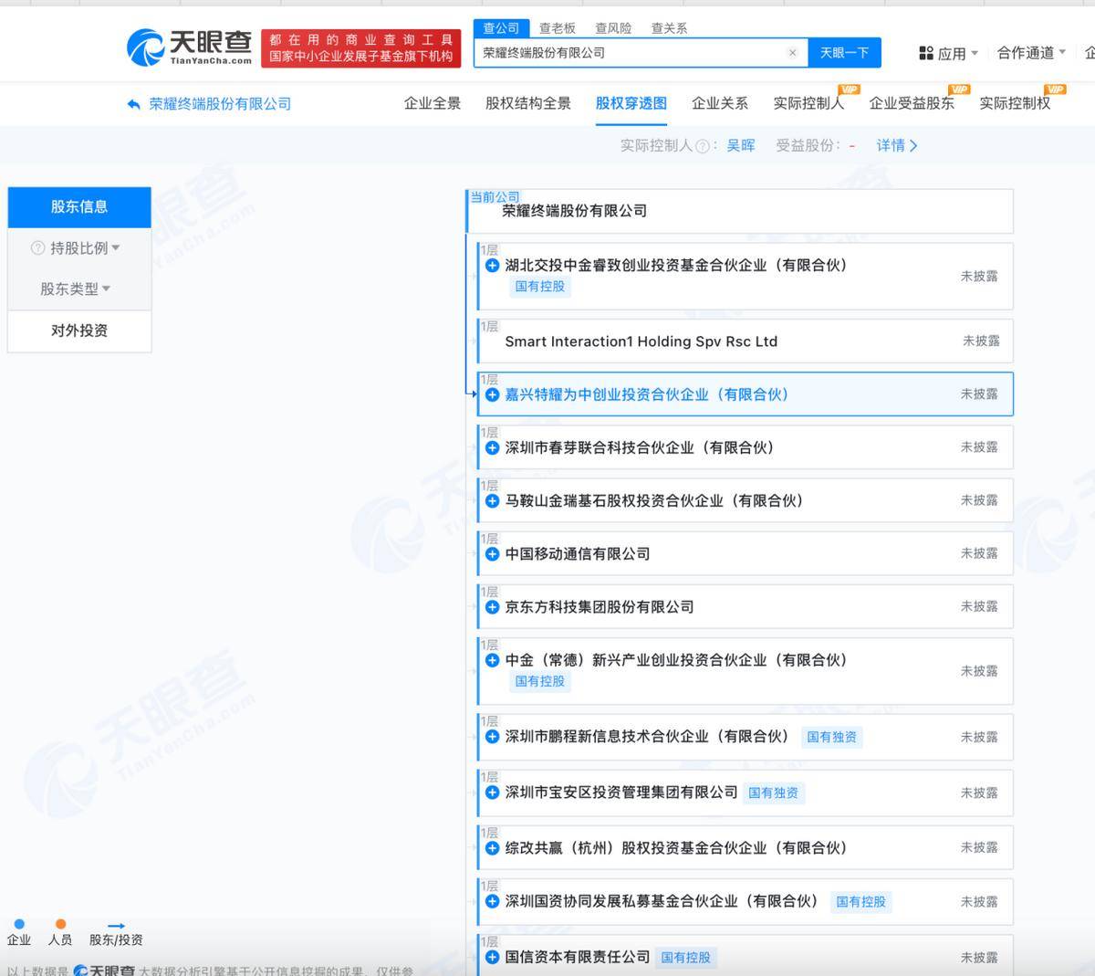 天眼查APP股权信息显示,股改之后,荣耀的机构股东剩下23家,包括中国电信、中金资本、金石投资,以及深圳国资旗下的国信资本、深圳鹏程新信息、深圳耀星辰壹号。