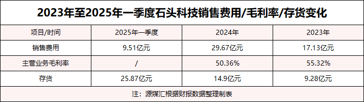 财报数据显示,2023年至2024年,石头科技的销售费用从17.13亿元涨至29.67亿元;主营业务毛利率则从55.32%降至50.36%;同期的存货金额也跟随上涨。