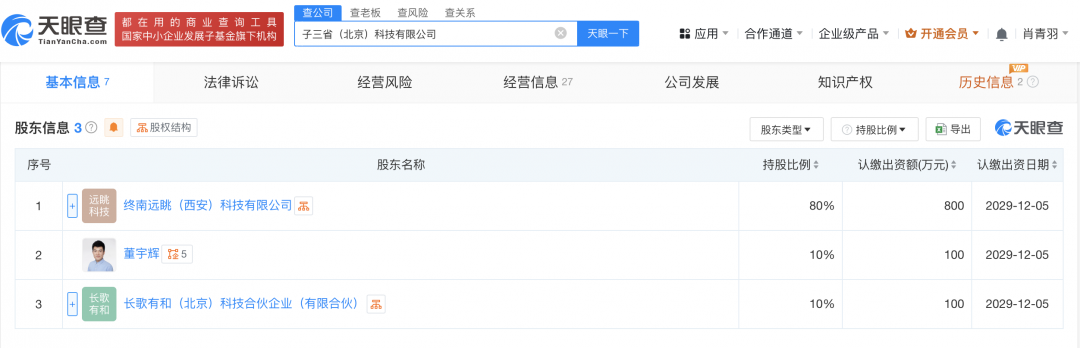 子三省(北京)科技有限公司成立于2024年12月,法定代表人为董宇辉,注册资本1000万人民币,经营范围包括互联网信息服务、广播电视节目制作经营、演出经纪、出版物批发等,由终南远眺(西安)科技有限公司、董宇辉、长歌有和(北京)科技合伙企业(有限合伙)共同持股。