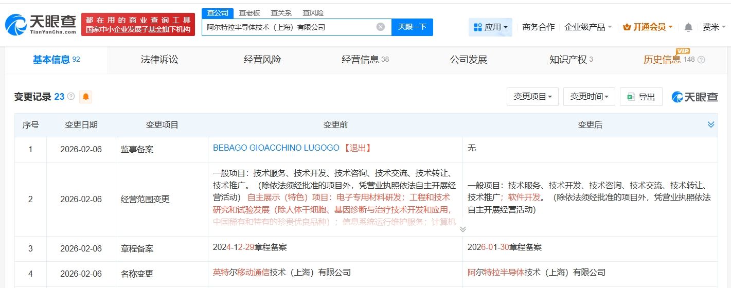 天眼查App显示,近日,英特尔移动通信技术(上海)有限公司发生工商变更,企业名称变更为阿尔特拉半导体技术(上海)有限公司。值得一提的是,去年3月,原股东INTEL DEUTSCHLAND GMBH退出,新增ALTERA HOLDINGS CORP.为全资股东。