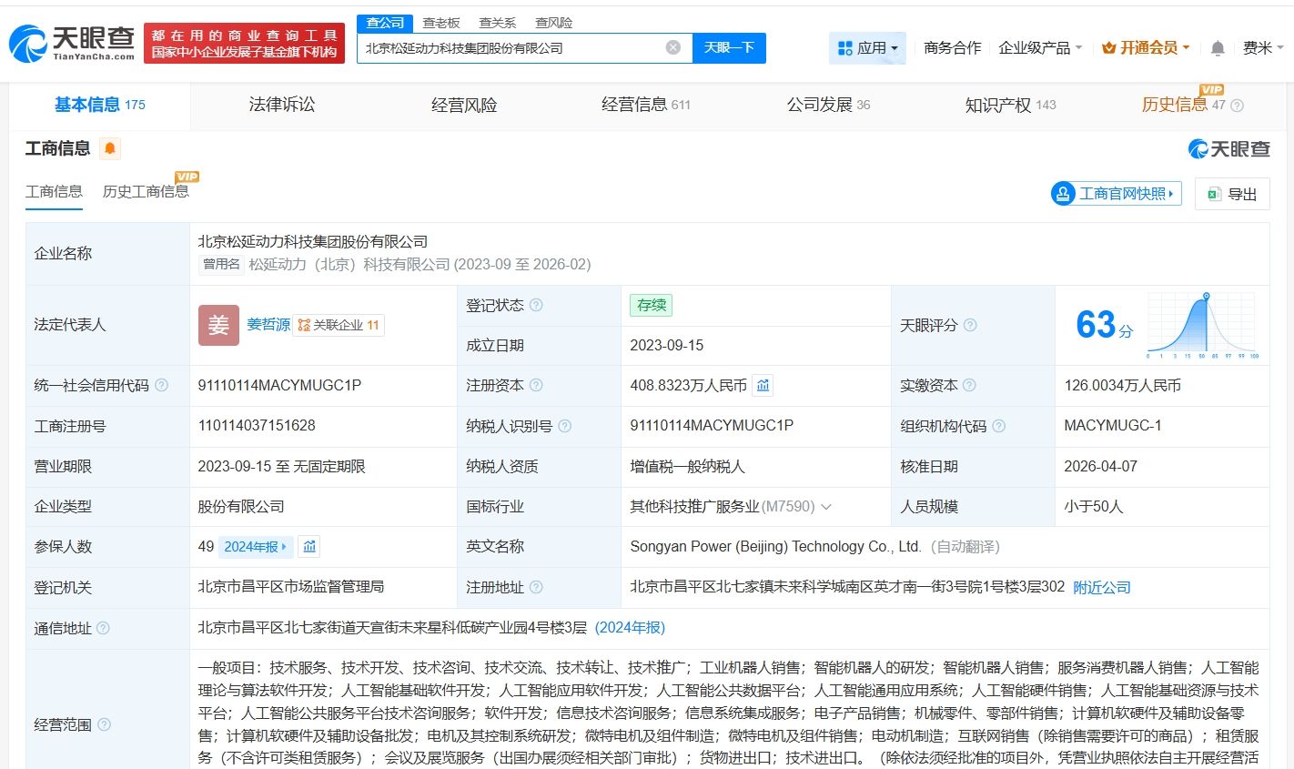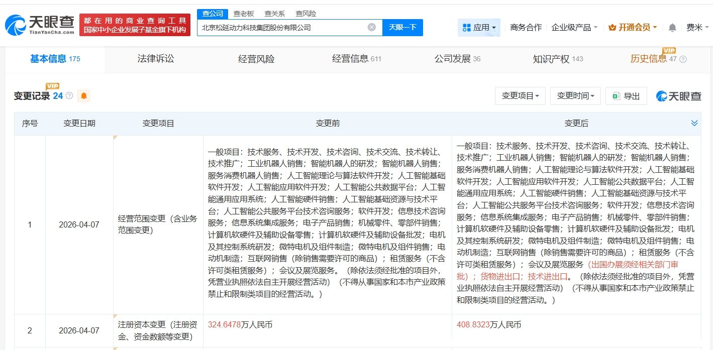 天眼查工商信息显示,近日,北京松延动力科技集团股份有限公司发生工商变更,注册资本由约324.6万人民币增至约409万人民币,增幅约26%。