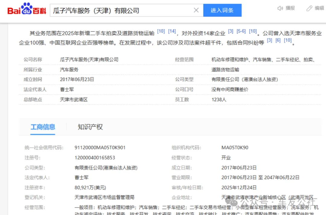 而购车凭证上的签章单位为“瓜子汽车服务(天津)有限公司”,成立于2017年6月23日,注册资本高达约8.09亿美元,法定代表人曹士军,企业类型为有限责任公司(港澳台法人独资)。该公司是北京母公司的控股子公司,作为承担实际交易执行的独立法人,在天津武清区注册,且在全国各地设有分公司(如瓜子汽车服务(天津)有限公司北京分公司、上海分公司等)。