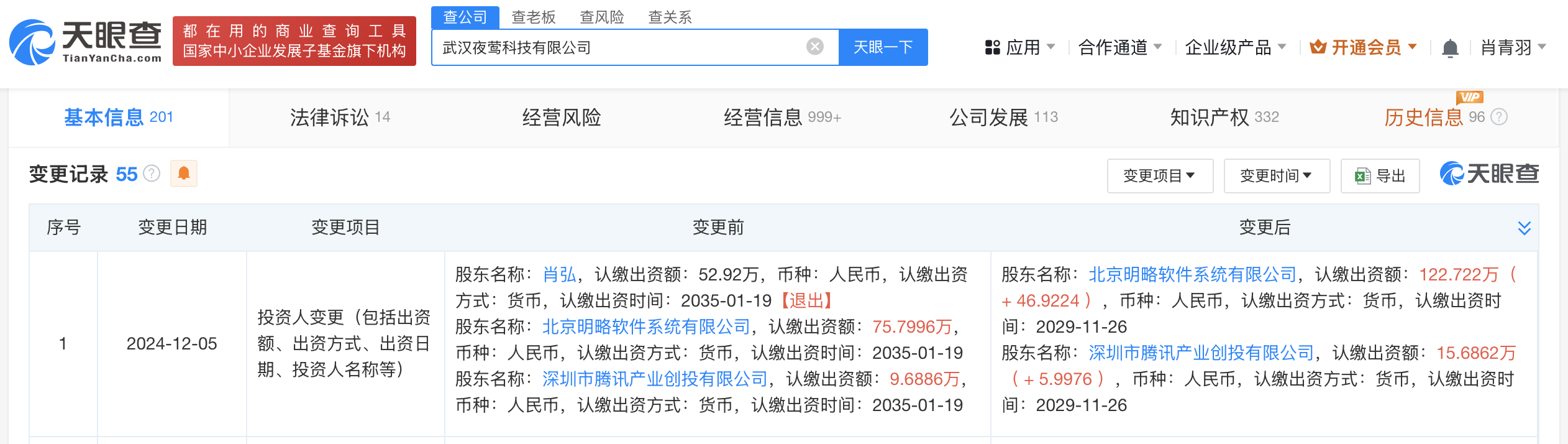 此外,肖弘名下还曾关联1家武汉夜莺科技有限公司,其于2024年12月退出该公司股东,融资历史显示,该公司获得4轮融资,投资方包括腾讯、真格基金、明略科技等。
