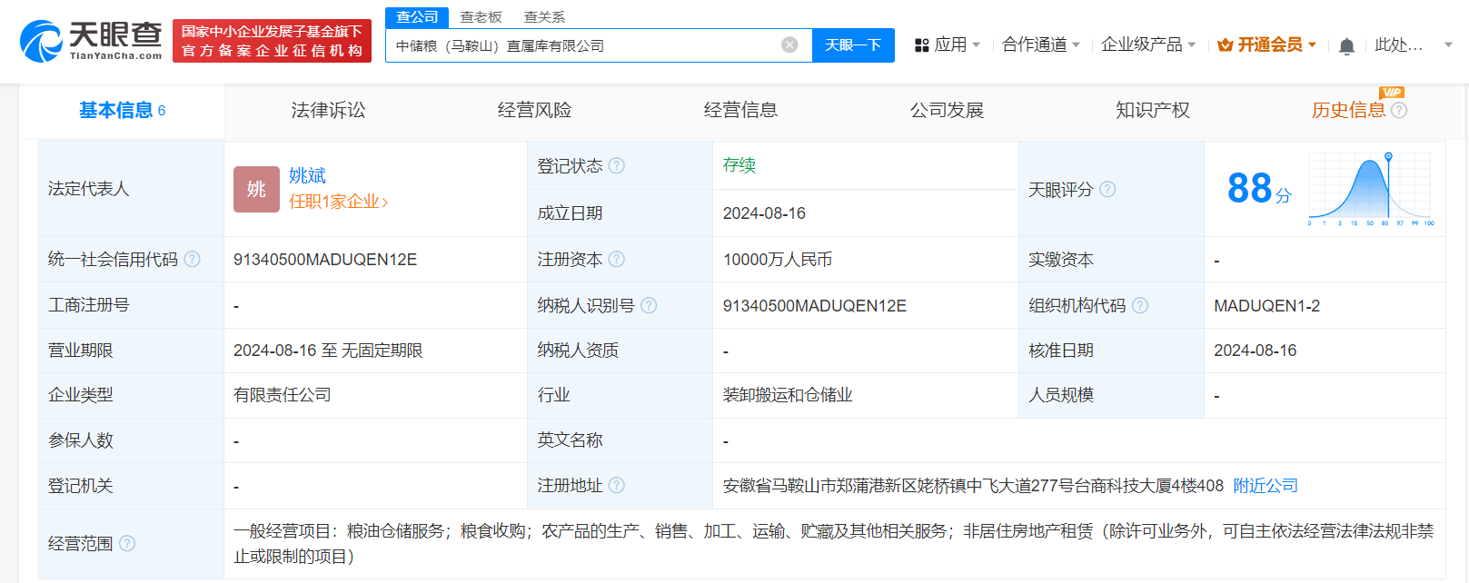 天眼查App显示,近日,中储粮(马鞍山)直属库有限公司成立,法定代表人为姚斌,注册资本1亿人民币,经营范围为粮油仓储服务,粮食收购,农产品的生产、销售、加工、运输、贮藏及其他相关服务,非居住房地产租赁,由中国储备粮管理集团有限公司全资持股。
