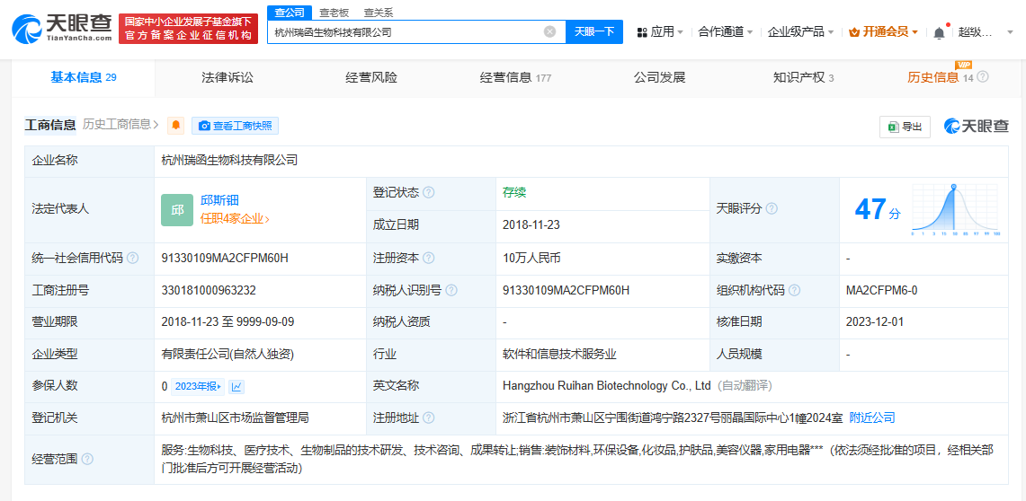 天眼查App显示,韩安冉共关联6家企业,其中3家为存续状态,包括广州洁冉生物科技有限公司、杭州冉西品牌运营管理有限公司、杭州彦恩医疗美容诊所有限公司。韩安冉在3家公司担任执行董事、监事等职务,并在前2家公司持股。值得一提的是,韩安冉曾与母亲唐英英曾共同在杭州瑞函生物科技有限公司任职,该公司系韩安冉前夫邱斯钿控股公司,2022年11月,韩安冉与母亲唐英英均退出该公司。目前,母女二人已无商业关联。