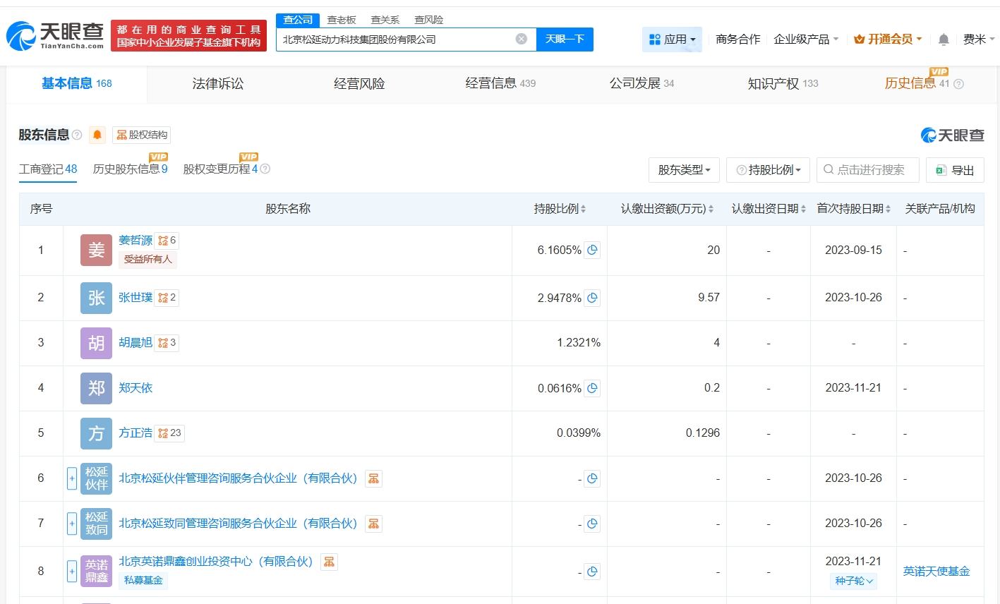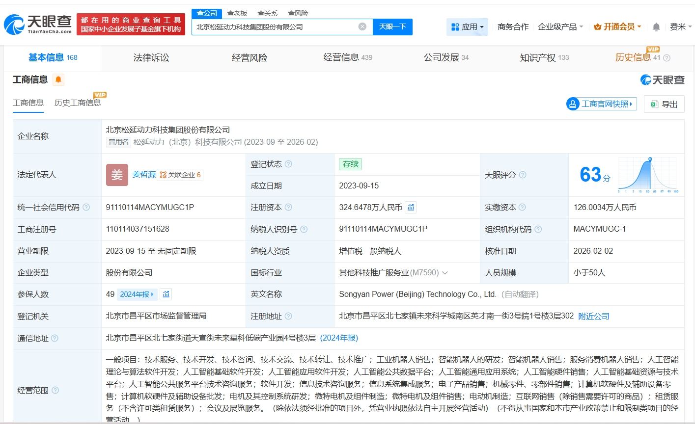 天眼查工商信息显示,北京松延动力科技集团股份有限公司成立于2023年9月,法定代表人为姜哲源,注册资本约325万人民币,经营范围包括工业机器人销售、智能机器人的研发、智能机器人销售等。股东信息显示,该公司由姜哲源、北京松延伙伴管理咨询服务合伙企业(有限合伙)、北京松延致同管理咨询服务合伙企业(有限合伙)等共同持股。