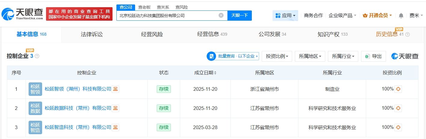 天眼查工商信息显示,北京松延动力科技集团股份有限公司成立于2023年9月,法定代表人为姜哲源,注册资本约325万人民币,经营范围包括工业机器人销售、智能机器人的研发、智能机器人销售等。股东信息显示,该公司由姜哲源、北京松延伙伴管理咨询服务合伙企业(有限合伙)、北京松延致同管理咨询服务合伙企业(有限合伙)等共同持股。控制企业信息显示,去年,该公司成立了松延智领(湖州)科技有限公司、松延数据科技(常州)有限公司、松延智造科技(常州)有限公司。变更记录信息显示,今年2月,该公司企业名称由松延动力(北京)科技有限公司变更为北京松延动力科技集团股份有限公司,此外,该公司去年多次发生增资。